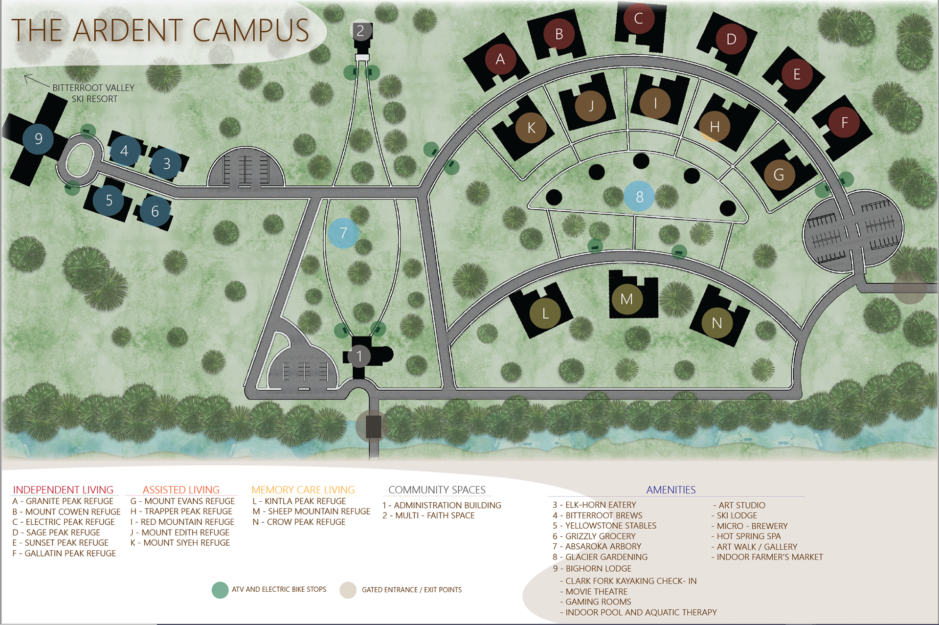 Ardent was a senior living community nestled into the mountains and valleys of Missoula, Montana. This project encompassed my entire undergraduate degree into one large campus. I was tasked with creating a luxury community - complete with amenities, administration, a multi-faith space, and dwellings. This retirement refuge was created on a feeling of warmth and high-class life.